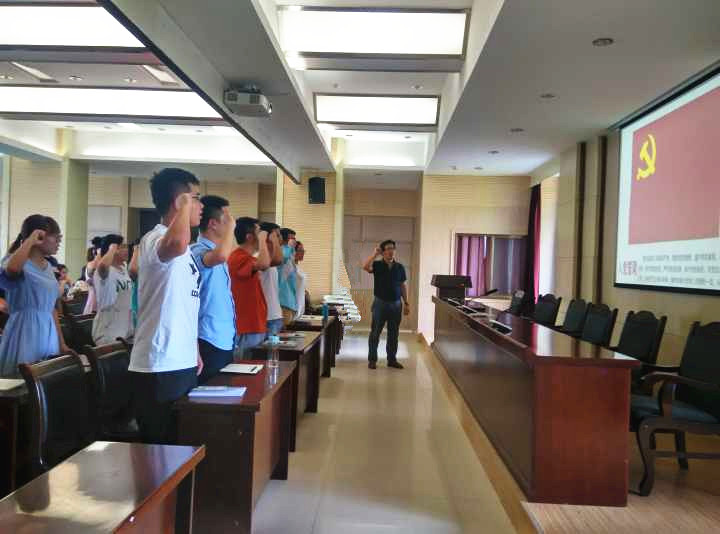 在主题党日活动会上,22名上半年新发展党员面向党旗集体庄严宣誓,引导其他党员重温入党誓词。
