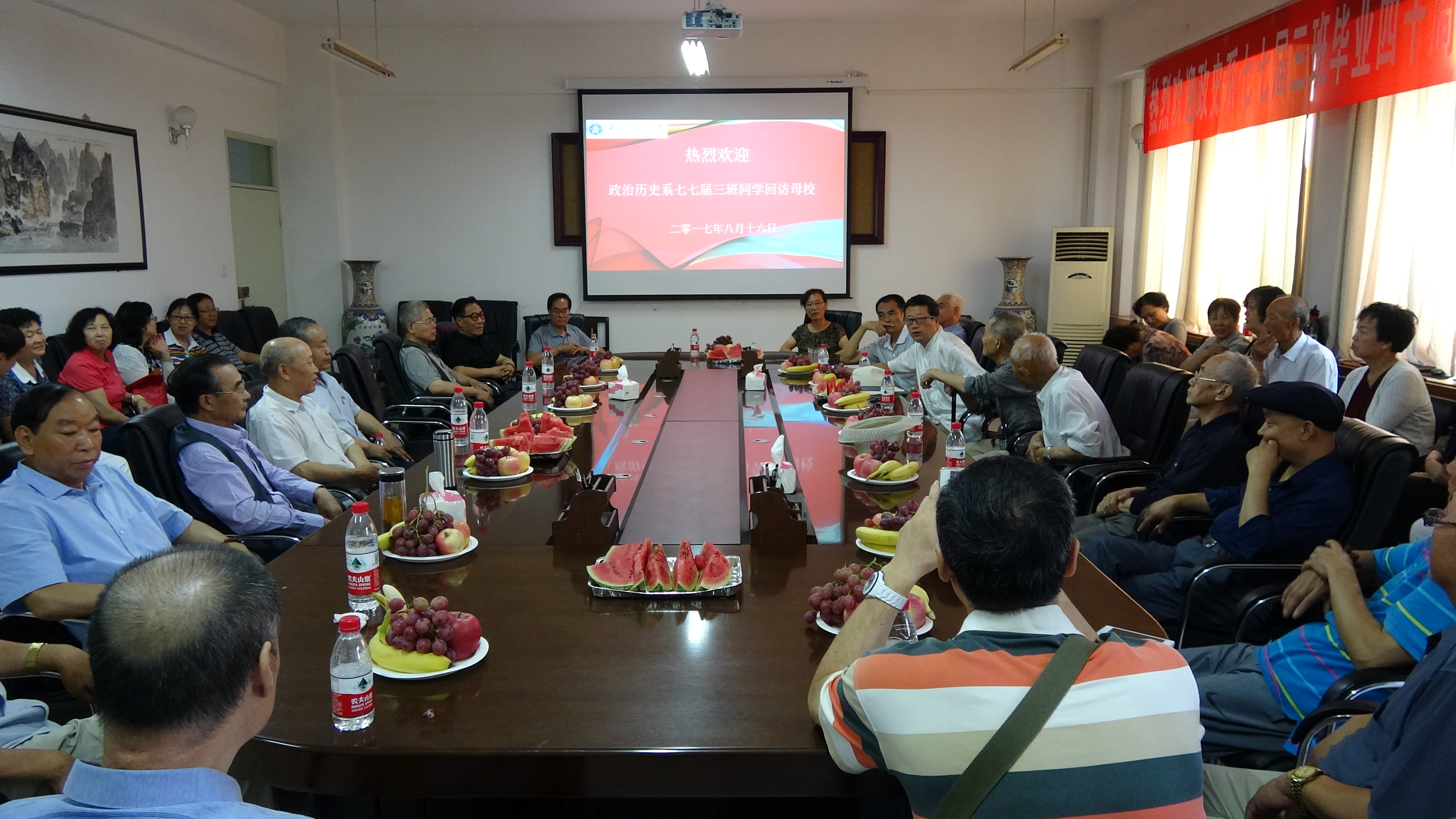 悠悠四十载,浓浓师大情。8月16日,学院307会议室里,笑语阵阵,政治历史系77届3班校友毕业40年返校聚会,共忆青春美好岁月。来自全国各地的30多名校友参加了座谈会,学院姜宗强副院长、左利平副院长及离退休老师陈贵言、石天杰、马中晋老师等与校友们欢聚一堂、共叙情谊。座谈会由聚会筹备组负责人李育红老师主持。