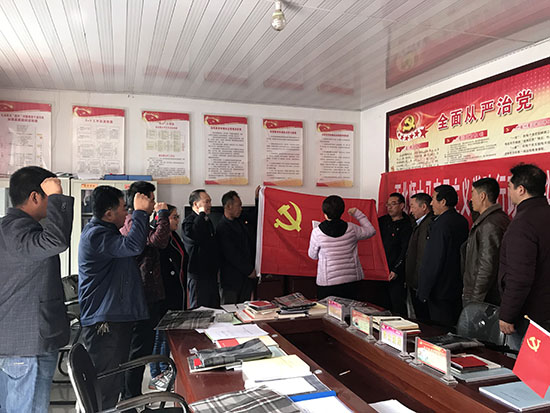 两个支部党员面对党旗,重温入党誓词,鞭策自己时刻不忘初心,发挥好党员的模范带头作用,力争早日打赢脱贫攻坚战。