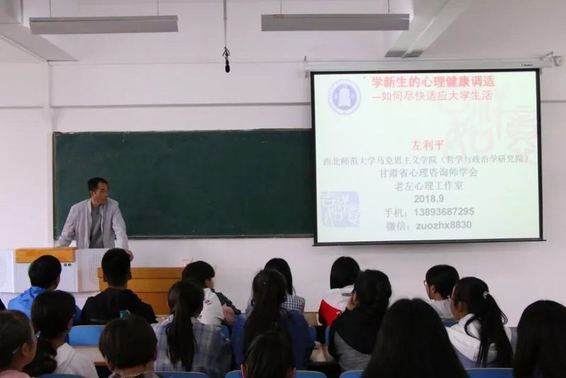 2018年9月17日下午,退休教师左利平老师为新生做题为“新生的心理健康调适——如何尽快适应大学生活”的团体心理辅导报告,从如何度过大学生活的迷茫期,如何尽快适应大学生活, 如何修炼自主管理能力,心理适应的关键等四个方面为新生提供心理辅导。