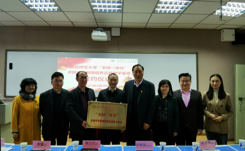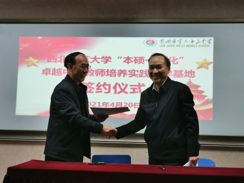 为进一步推进“本硕一体化”卓越中学教师培养项目的实施,拓展本硕一体生教学实践基地的规模,2021年4月20日上午,yl6809永利党委书记符得团、副院长金建萍、办公室主任李靖、本硕一体生班主任马乔恩一行前往兰州市第六十三中学举行了西北师范大学“本硕一体化”卓越中学教师培养实践教学基地签约挂牌仪式。兰州市六十三中学党总支书记李震、校长陈王生、副校长马得维,甘肃省思想政治理论课刘永兰名师工作室主持人刘永兰老师等教师出席了此次活动,参与此次签约挂牌仪式的还有正在六十三中学参加培训的兰州市全体初中思政课教师。