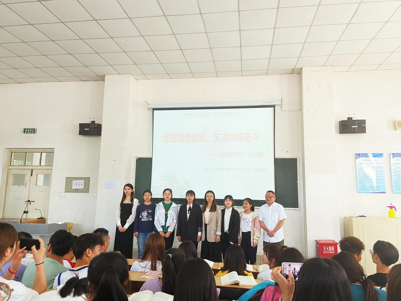 邓西延、年更尕、张亚婷、严盼盼四名成员分别介绍了中国共产党带领广大人民脱贫的百年历史、伟大成就、中国经验与世界意义;张慧茹、马冰、王楠三名成员带领大家踏上历史专列,这趟列车由会宁到腊子口,最后到达哈达铺,一段段感人故事、一幕幕动人场景,引导师生共同回顾了红军长征的艰难历程与奋斗精神,最终指出青年学生应如何走好新时代长征路。